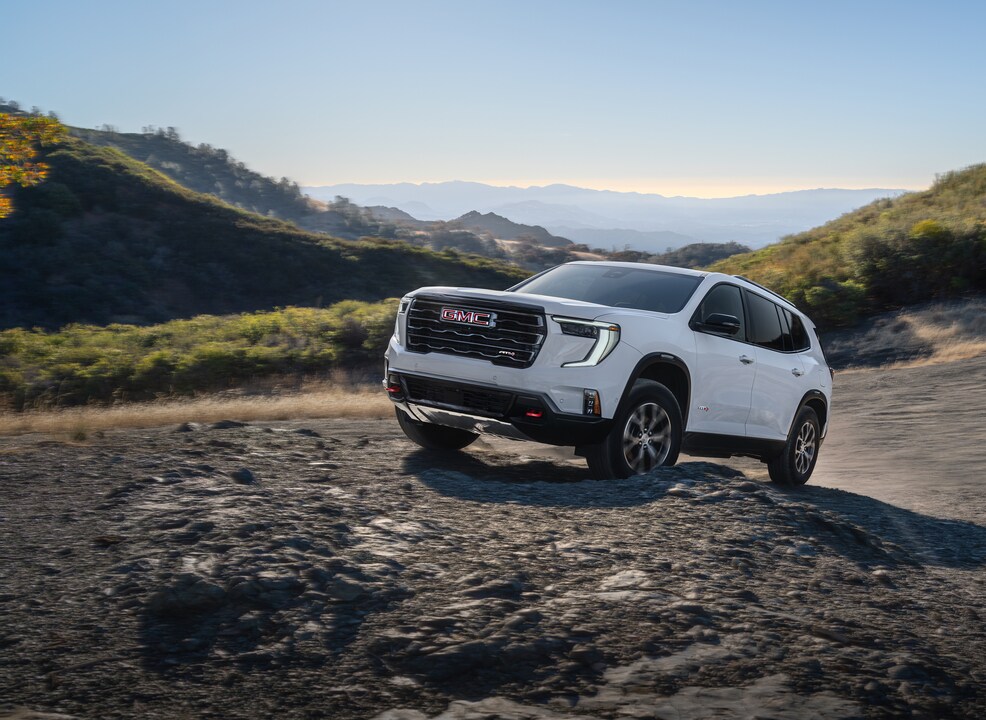 Off-road Acadia AT4 models have an exclusive dark-accented exterior and Forest Storm interior, along with an exclusive Terrain Mode, all-terrain tires, an off-road tuned suspension, and an Active Torque Control AWD system.