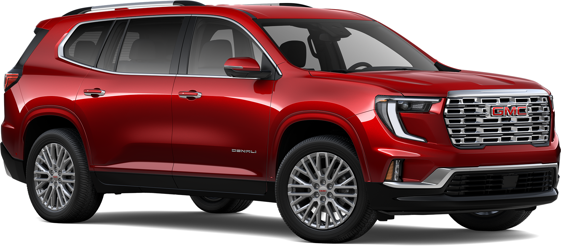 The upscale Acadia trim gets a Denali grille, Denali badging, Galvano Silver accents, a premium interior with leather-appointed seats in the first two rows, a configurable 8-inch Head-Up Display, heated and ventilated front seats, and 20-inch aluminum wheels in a Pearl Nickel finish.
